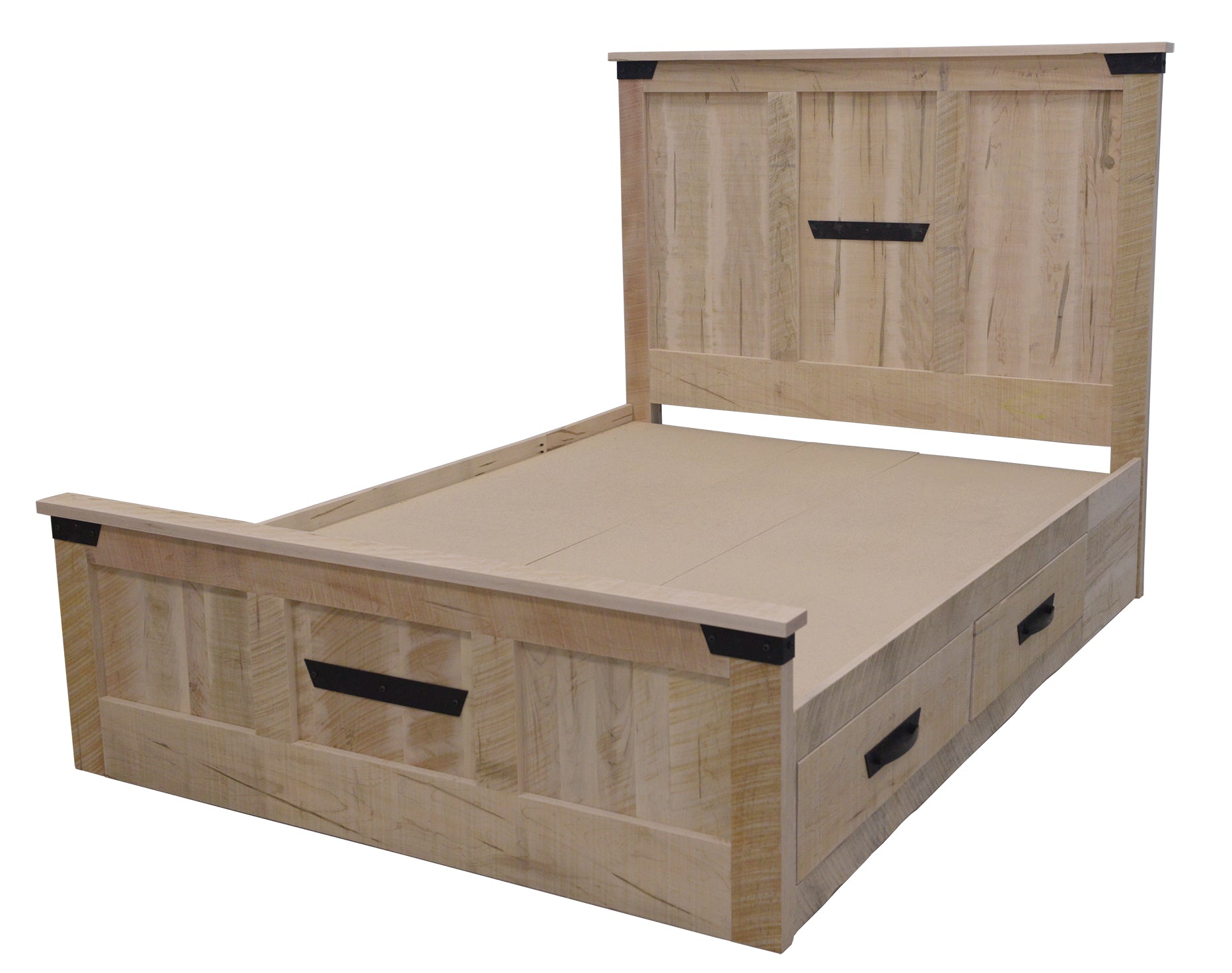 Available with drawers or  rails, this bed is accented with iron brackets on all corners and matching hardware.